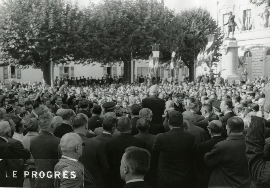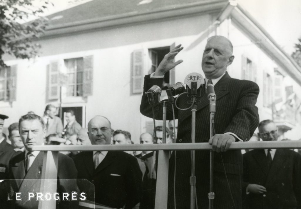 Le général de Gaulle à la tribune, devant l’hôtel de ville de Thonon-les-Bains, 8 octobre 1960.