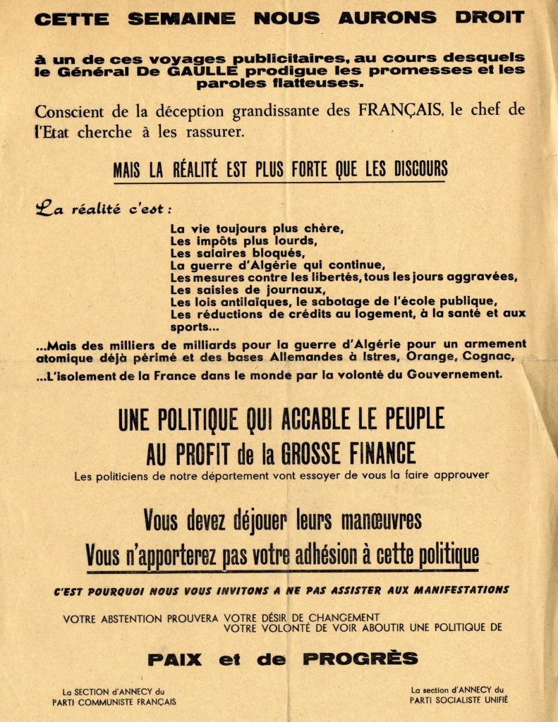 Tract d’opposition au général de Gaulle, qui émane du Parti communiste et du Parti socialiste unifié, octobre 1960.