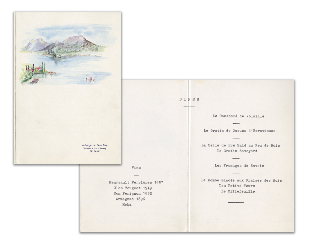 Menu établi par le père Bise pour le dîner officiel à la préfecture d’Annecy lors de la visite du général de Gaulle, 7 octobre 1960.