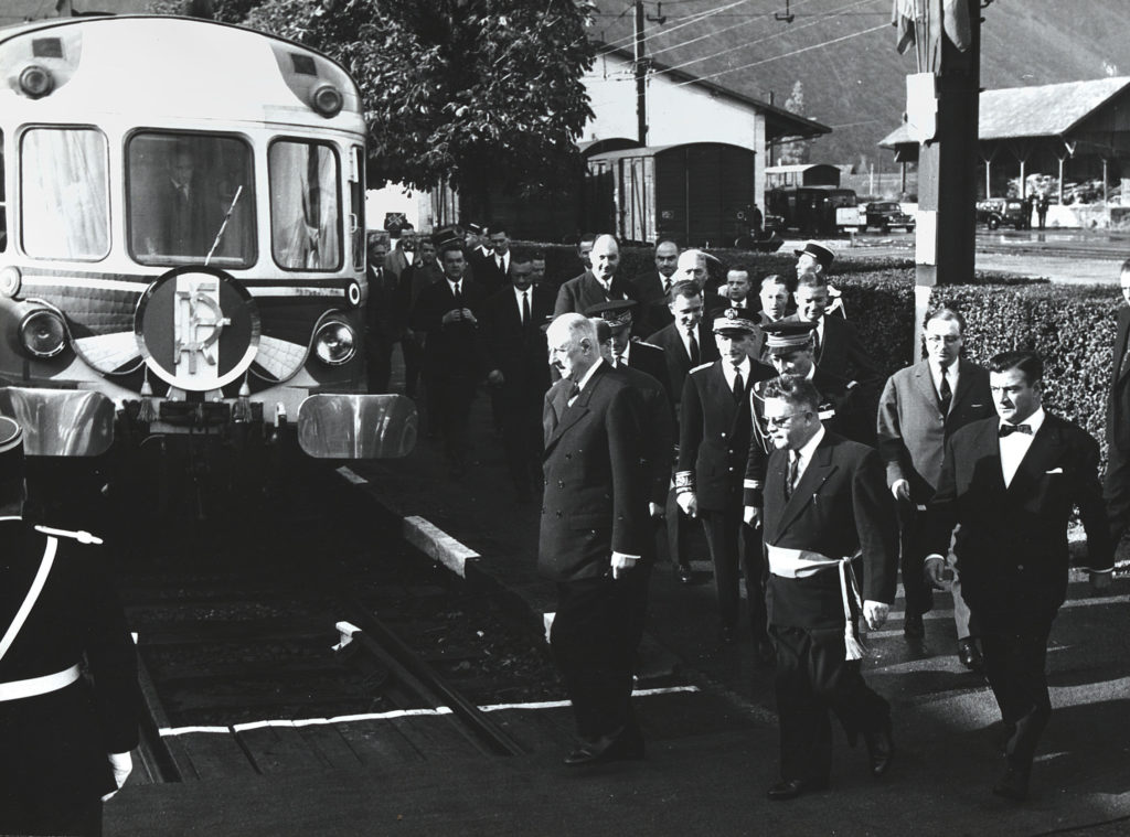 Visite à Saint-Jean-de-Maurienne : photographie du général de Gaulle lors de son arrivée à la gare, 9 octobre 1960.