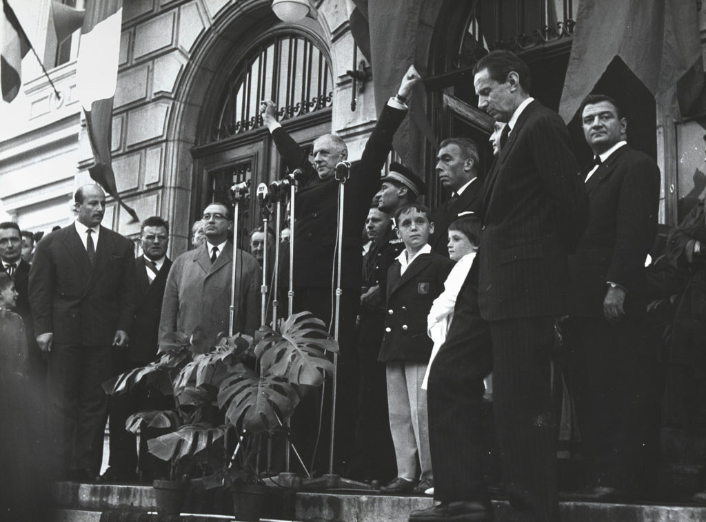 Visite à Albertville : photographie du général de Gaulle lors de son discours sur le perron de la mairie, 9 octobre 1960.