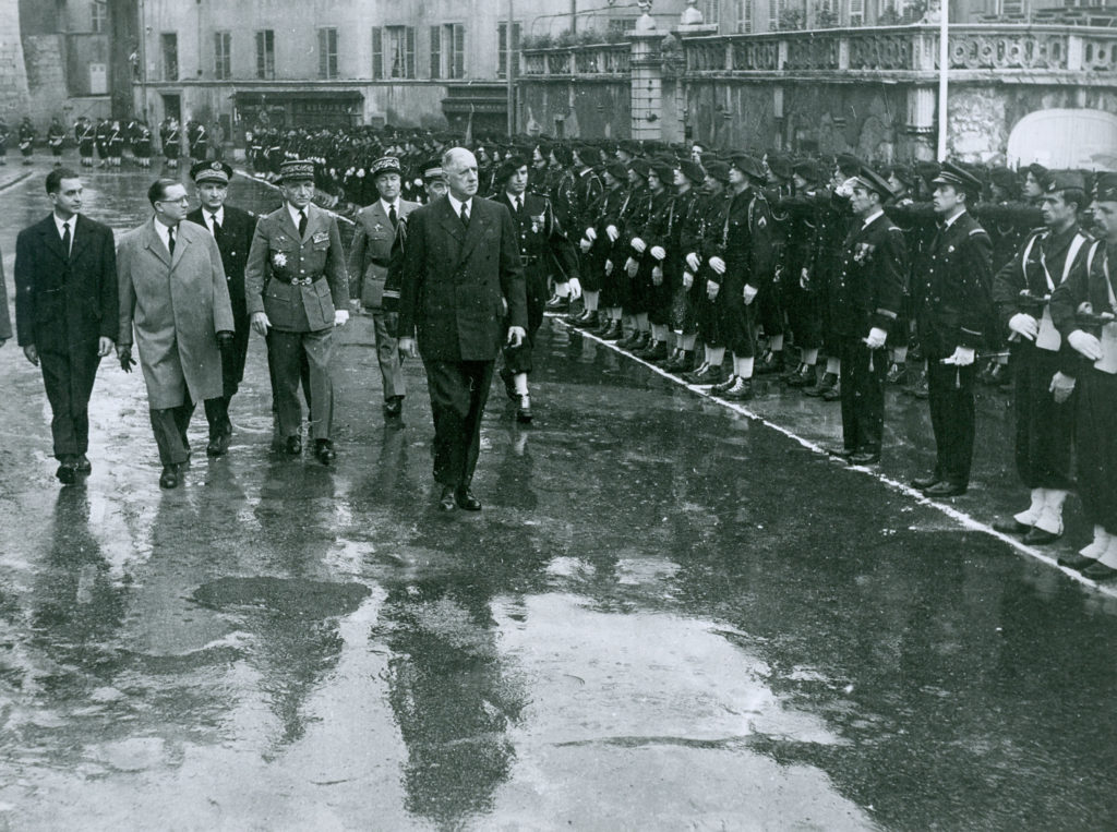 Visite à Chambéry : photographie du général de Gaulle accompagné d’officiers et d’élus pendant la revue des troupes sur la place du Château, 9 octobre 1960.