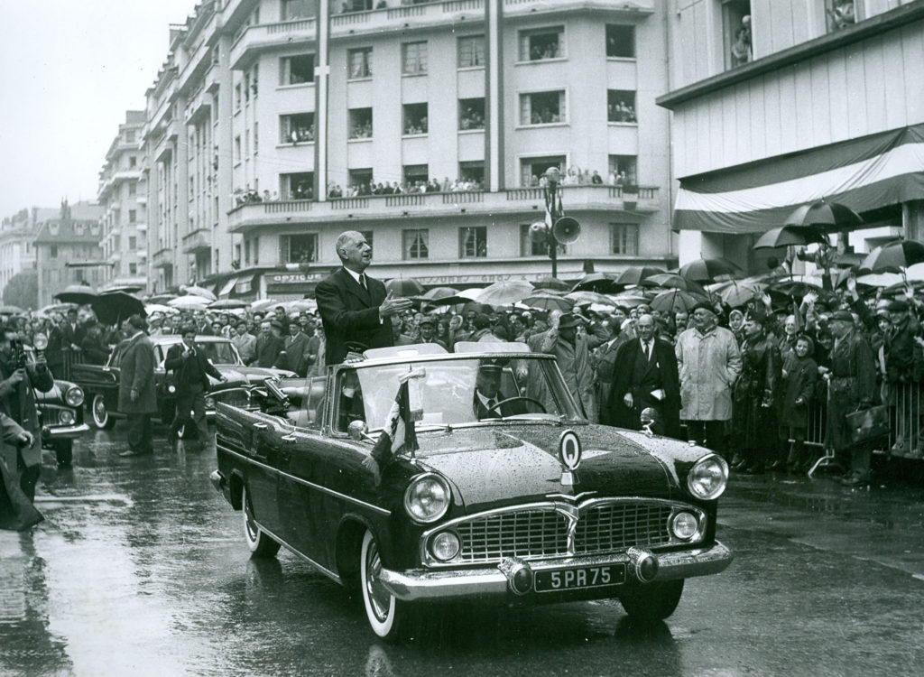 NB - la voiture est une Simca Vedette Présidence de 1960, conçue sur mesure pour le général de Gaulle. Construit en seulement deux exemplaires, l’un pour les défilés en province, l’autre pour l’accueil des personnalités étrangères à Paris, ce modèle a été rallongé de 18 cm.