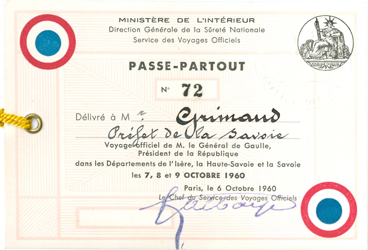 Organisation du voyage du général de Gaulle : passe-partout de Maurice Grimaud, préfet de la Savoie, 6 octobre 1960.