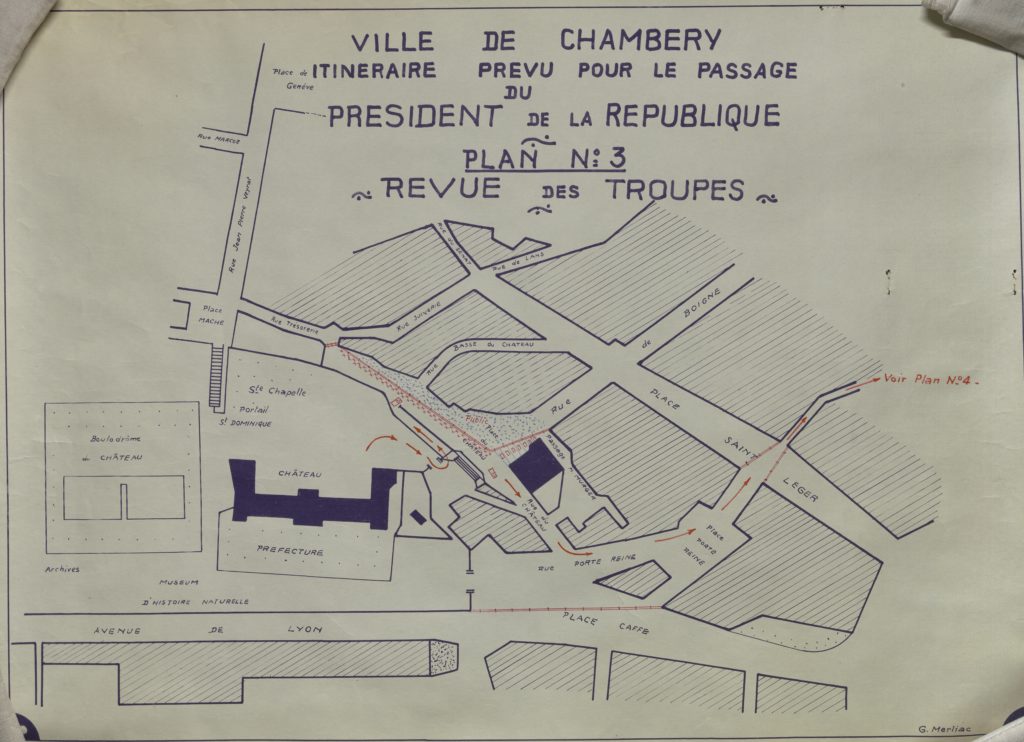 Visite à Chambéry : plan de l’itinéraire prévu pour la revue des troupes, 9 octobre 1960.