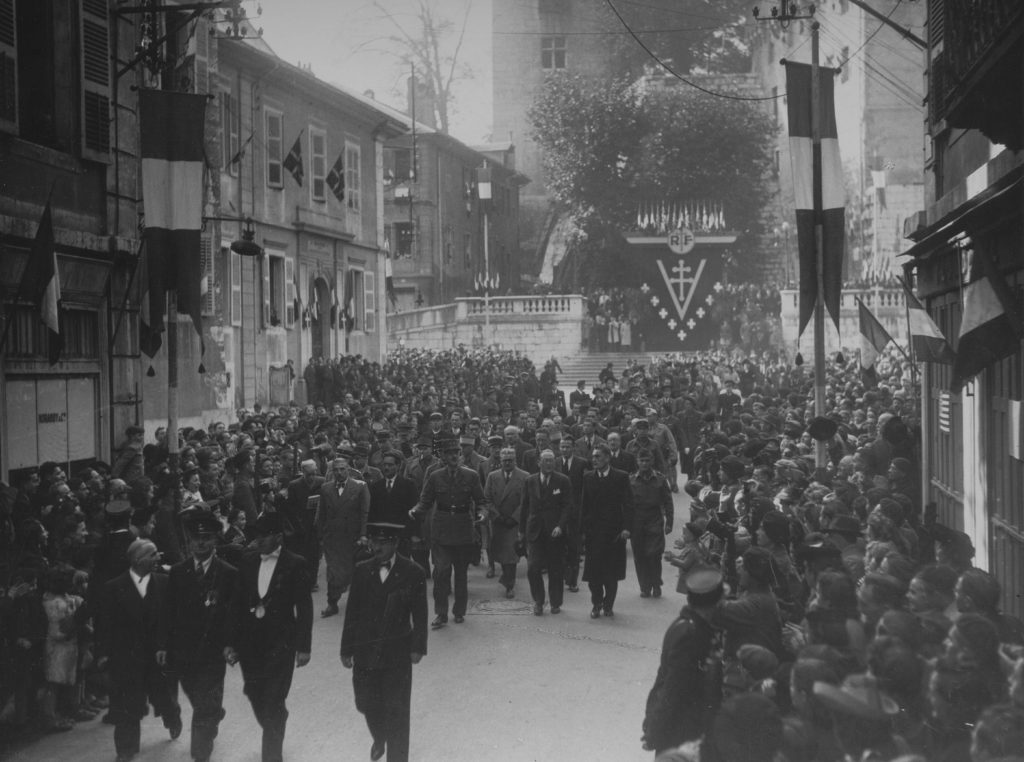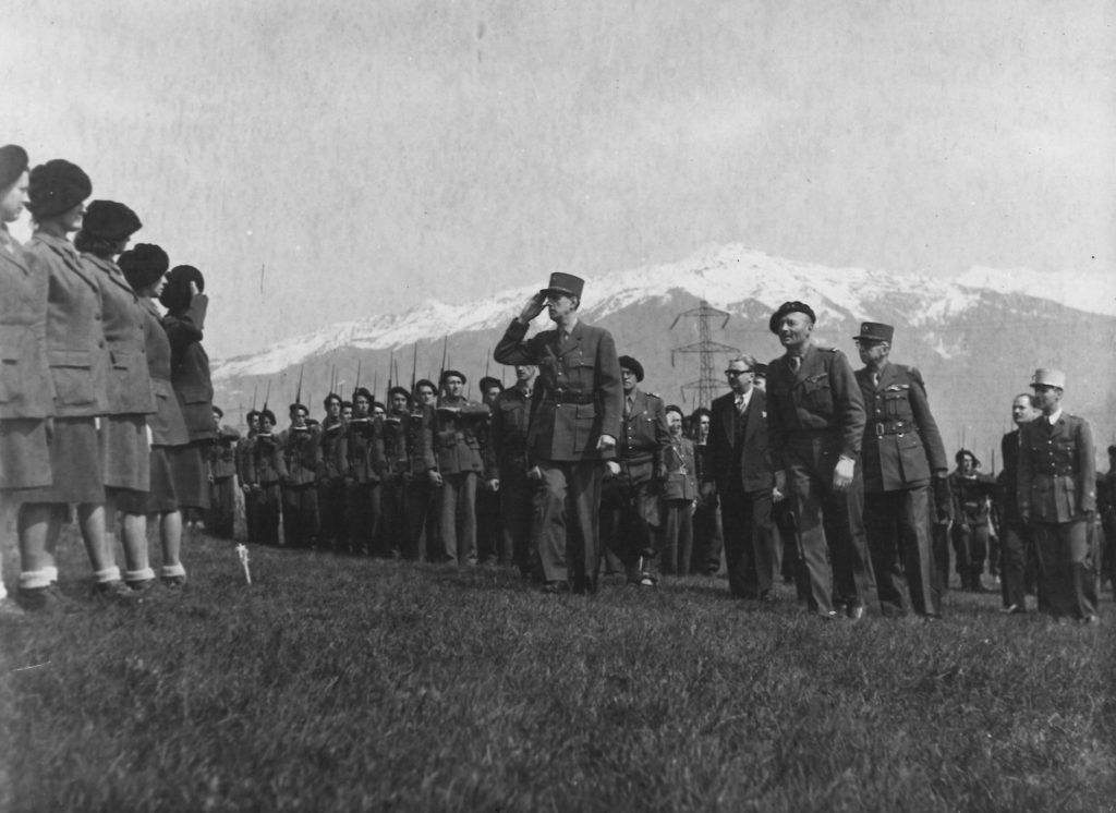 Libération des vallées alpines : photographie du général de Gaulle en visite à Saint-Pierre-d’Albigny en soutien à la 27e Division d’Infanterie Alpine (DIA), 8 avril 1945.