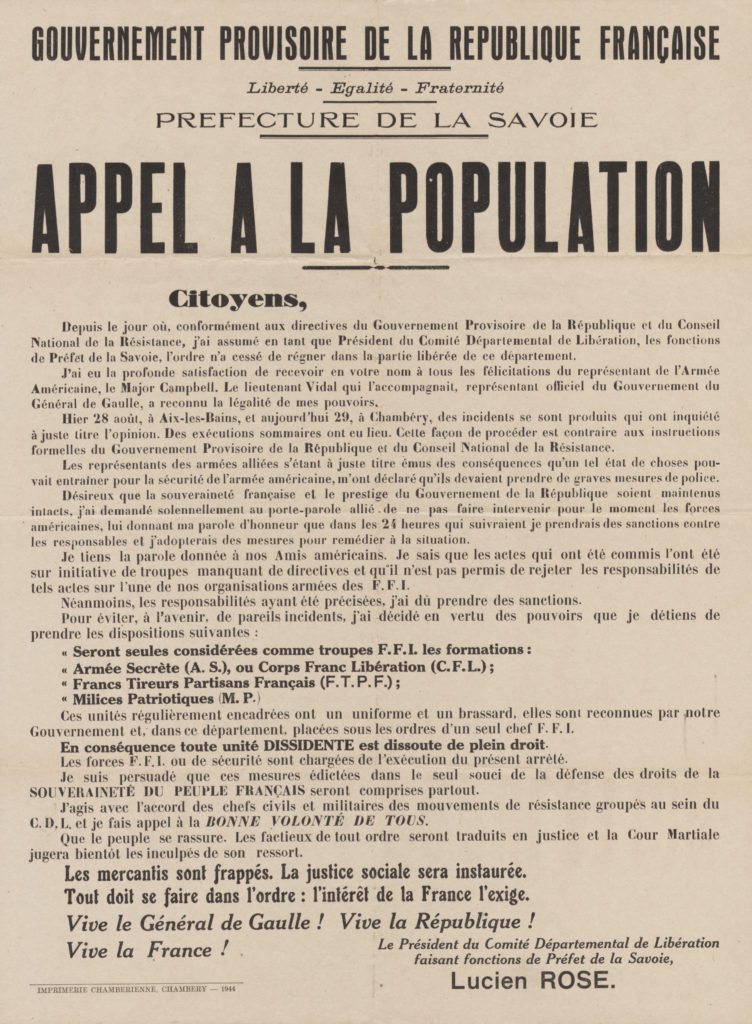 NB - L’acte est signé par le colonel Mayer, commandant des forces d’occupation, et par Joseph Lambroschini dit Nizier, chef des Forces Françaises de l’Intérieur (FFI) de Haute-Savoie.