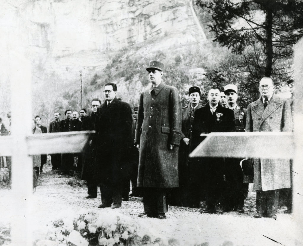 Le général de Gaulle au cimetière de Morette, avec à ses côtés François de Menthon, 5 novembre 1944.
