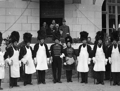 Visite du général de Gaulle à Thônes : discours à l’hôtel de ville avec les sapeurs-pompiers en costume traditionnel, 5 novembre 1944.